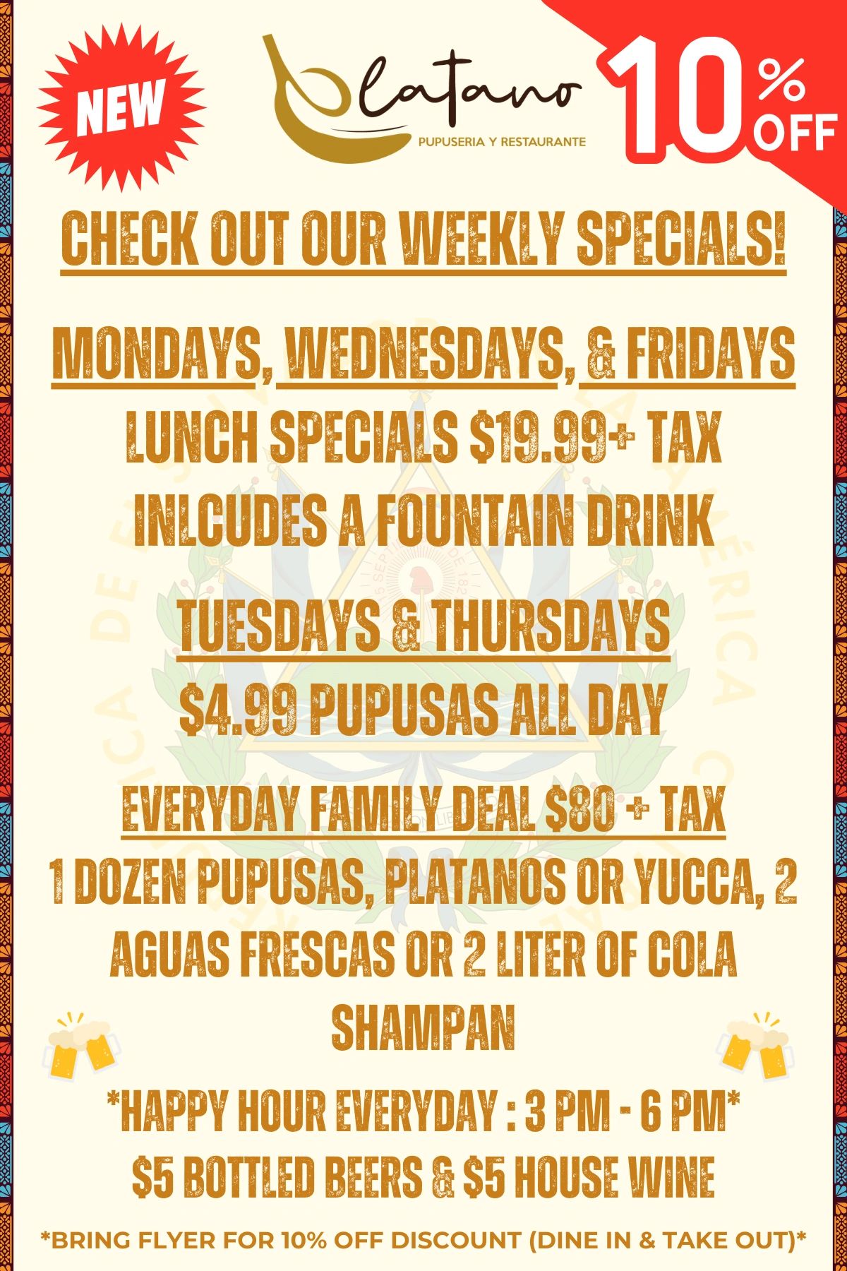 Tuesdays & Thursdays: Pupusa Day! All of our pupusas are $4.99 (Regularly $5.99), extra ingredients $.75 extra